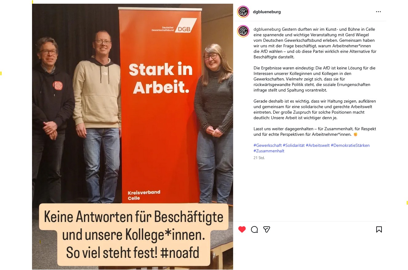 Wir Gewerkschafter*innen stehen für eine offene Gesellschaft und eine demokratische Arbeitswelt. Im Betrieb, auf der Straße, überall heißt es: Haltung zeigen – gegen antifeministische und menschenfeindliche Ideologien, die Gleichstellung und Solidarität gefährden.