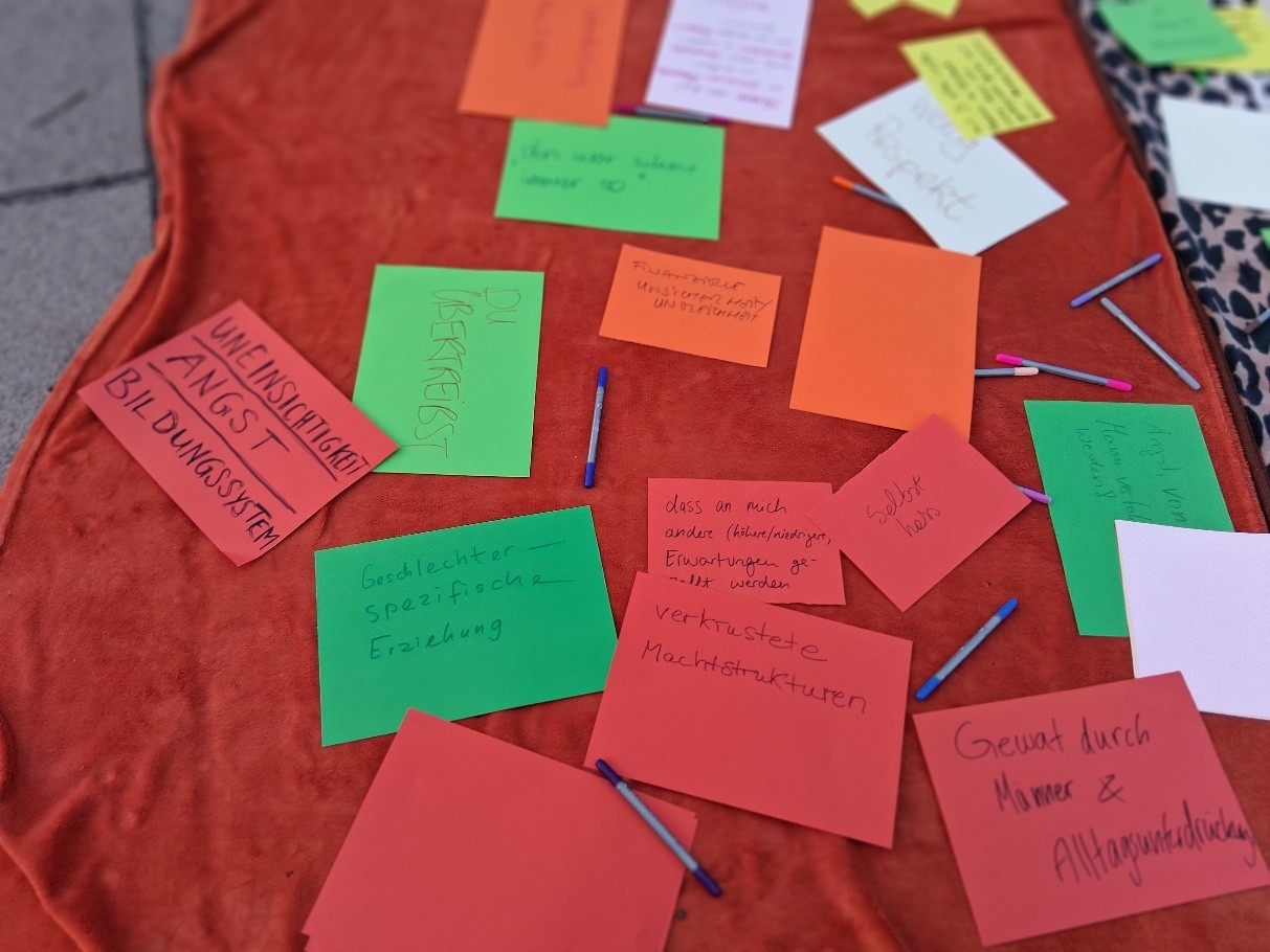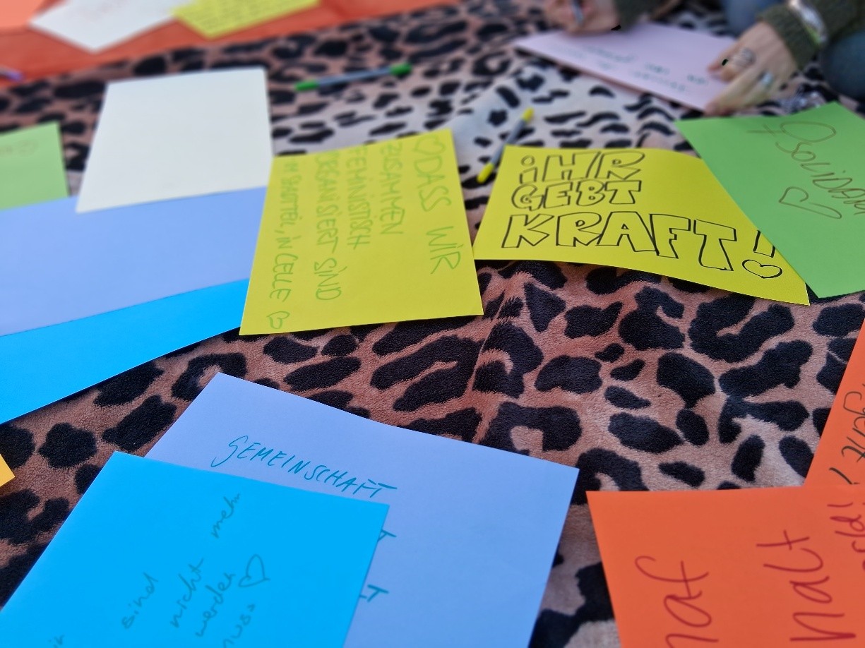 Wir stärken uns. Wir zeigen, dass ohne uns nichts läuft. Wir sprengen die Grenzen des patriarchalen Denkens und die Grenzen des Denkens in binären Geschlechtern. Wir sind viele, wir sind vielfältig, wir sind überall.